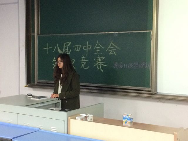 11月19日晚,外语学院英语11级毕业班学生党支部在松江校区第二教学楼举办十八届四中全会精神知识竞赛。支部成员分为两组,竞赛分为两个部分。