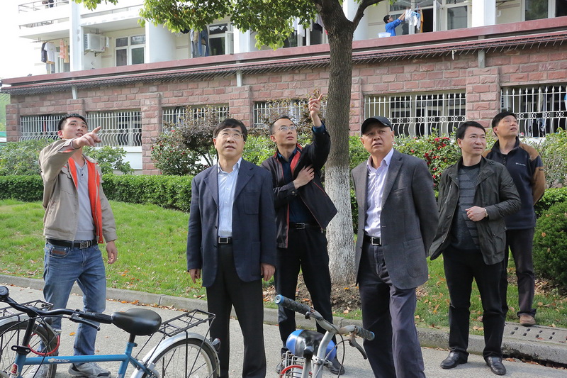 校领导在学生宿舍外查看空调外机安装情况