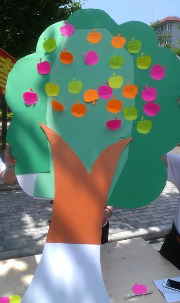 同学们的参与积极性都很高,来到苹果树齐前写下了自己的“正能量”,希望它能传递给需要它的同学,苹果树也被五颜六色的果实填满。