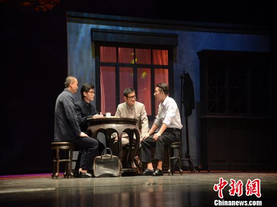图为原创话剧《钱宝钧》舞台剧照,钱宝钧(右二)与华东纺织工业局张方佐(左二)、张锡昌(左一)副局长及