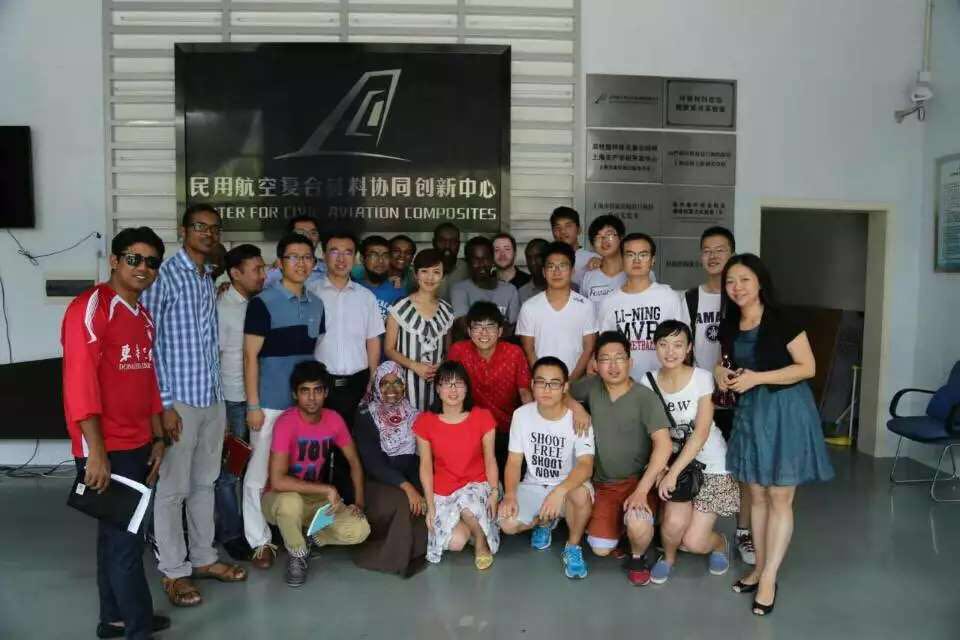 (图:中央电视台主播欧阳夏丹与我校服装学院、纺织学院、材料学院、国际文化交流学院、上海国际时尚创意学院、上海纺织服饰博物馆、民用航空复合材料协同创新中心等师生合影)