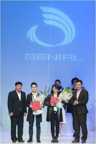 中国纺织建设规划院院长冯德虎、中国服装设计师协会副主席兼秘书长张庆辉为铜奖获得者俞梦婷颁奖