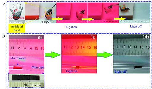 A图:一只石墨烯纸制作的人工手在光源明灭中抓取了小物件。