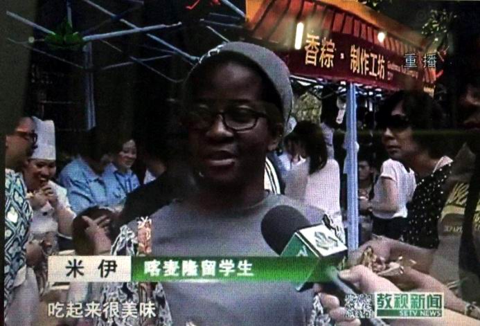 喀麦隆留学生米伊:粽子很棒,吃起来很美味,我非常喜欢。