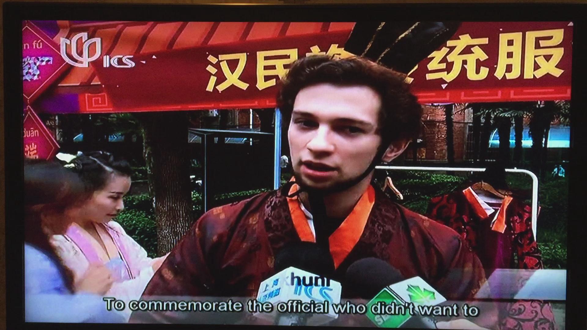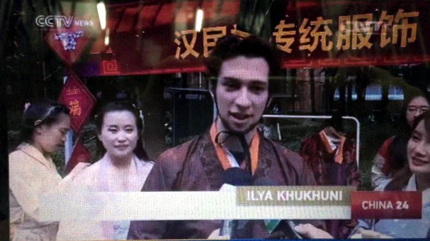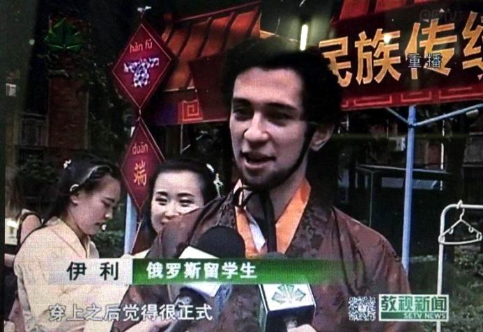 俄罗斯留学生伊利:感觉有点奇怪,穿上之后觉得很正式,也让我觉得我更加有中国味了。