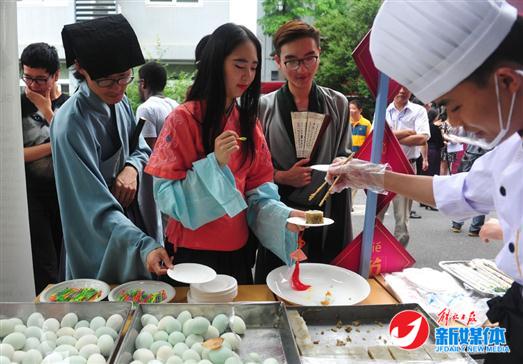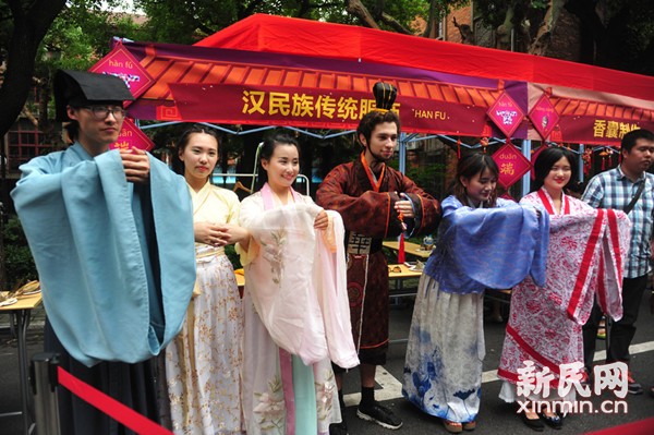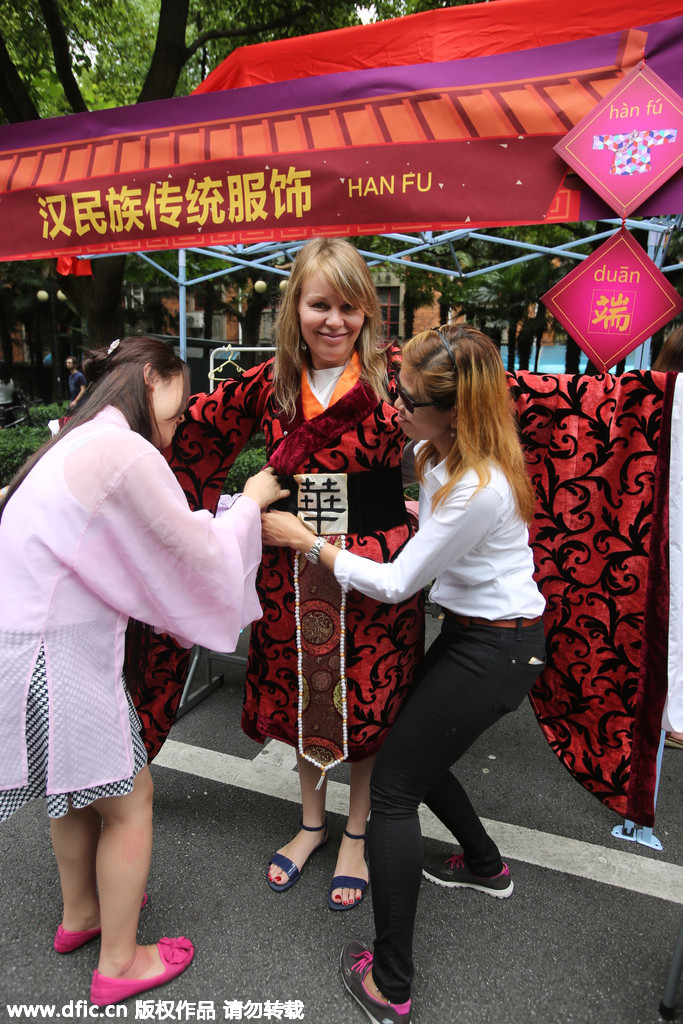 在另一边,在“中国汉族传统服饰”展台,古装飘飘的几位女子向众人展示了中国古代女子的三拜礼仪,尽显飘逸婉约之美。“端午节的由来有许多说话,其中一种来源于为了纪念中国古代诗人屈原的爱国精神……”这样头头是道地解说中国民俗的,是在国际交流学院学习东方学的俄罗斯小伙以利亚。他正被三个汉装同学围着,穿上内褂,套上外袍,系上腰带,带上顶冠。以利亚笑着说:“我自己肯定无法独自穿上这些,这真是个难得的机会。”