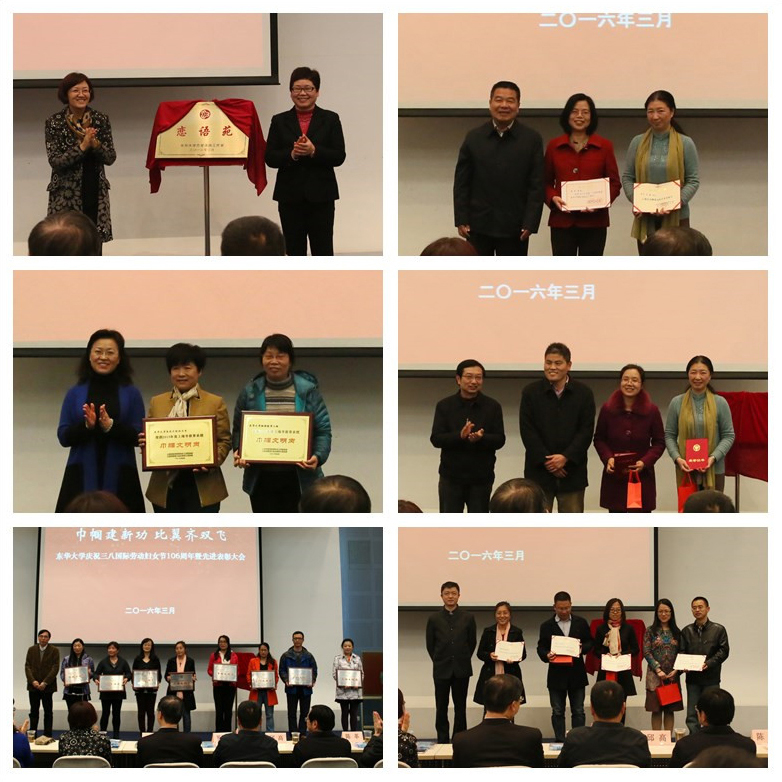 理学院郭颖老师、化工生物学院沈明武老师分别作为上海市教育系统巾帼文明岗获得团队、上海市教育系统比翼双飞模范佳侣代表在会上作了交流发言。