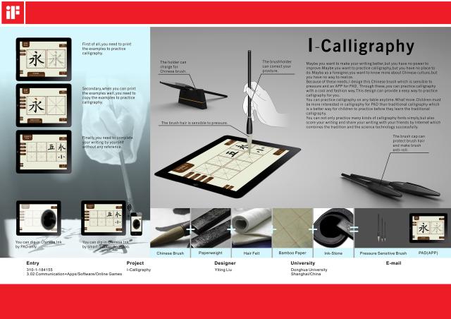 4月7日,全球工业设计权威奖项——德国IF设计奖公布了2016年度概念设计奖的获奖名单。机械学院工业设计系刘奕廷同学提交的“I Calligraphy”作品从11000多件参赛作品中脱颖而出,获得IF概念设计奖(iF STUDENT DESIGNAWARD 2016)。