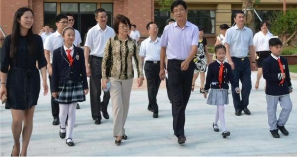(上海市副市长翁铁慧(前排左三)在付炳建校长陪同下视察东华附校)