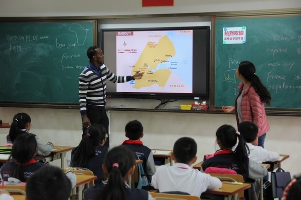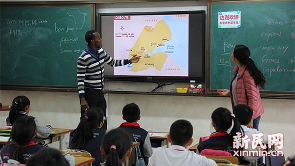 (来自吉布提的留学生向孩子们介绍非洲的风土人情)