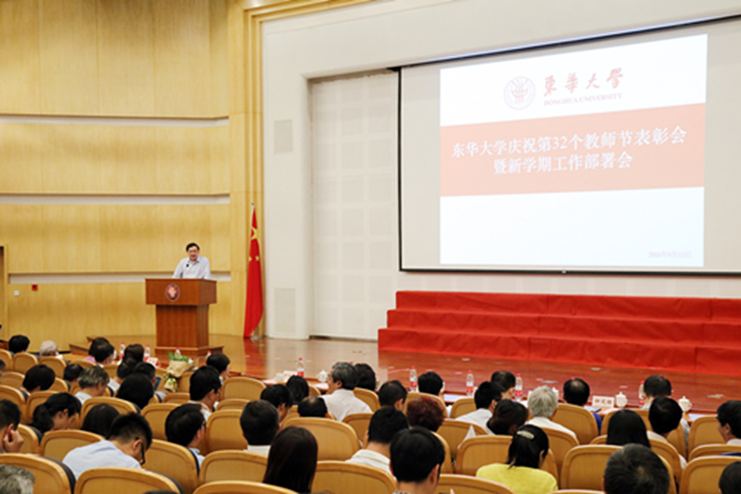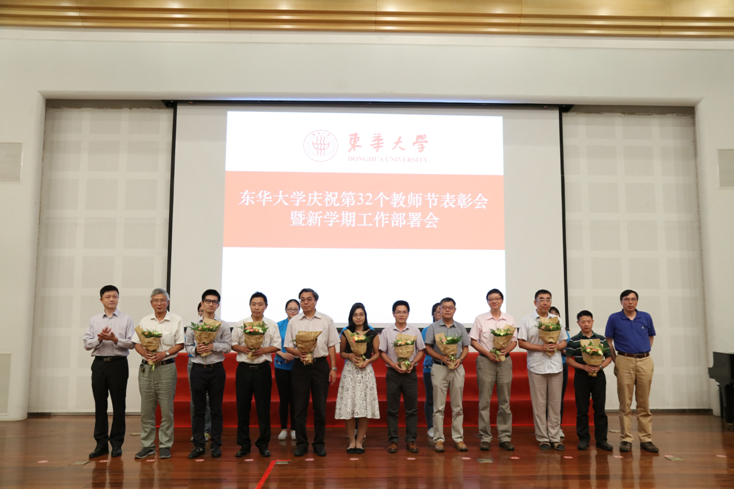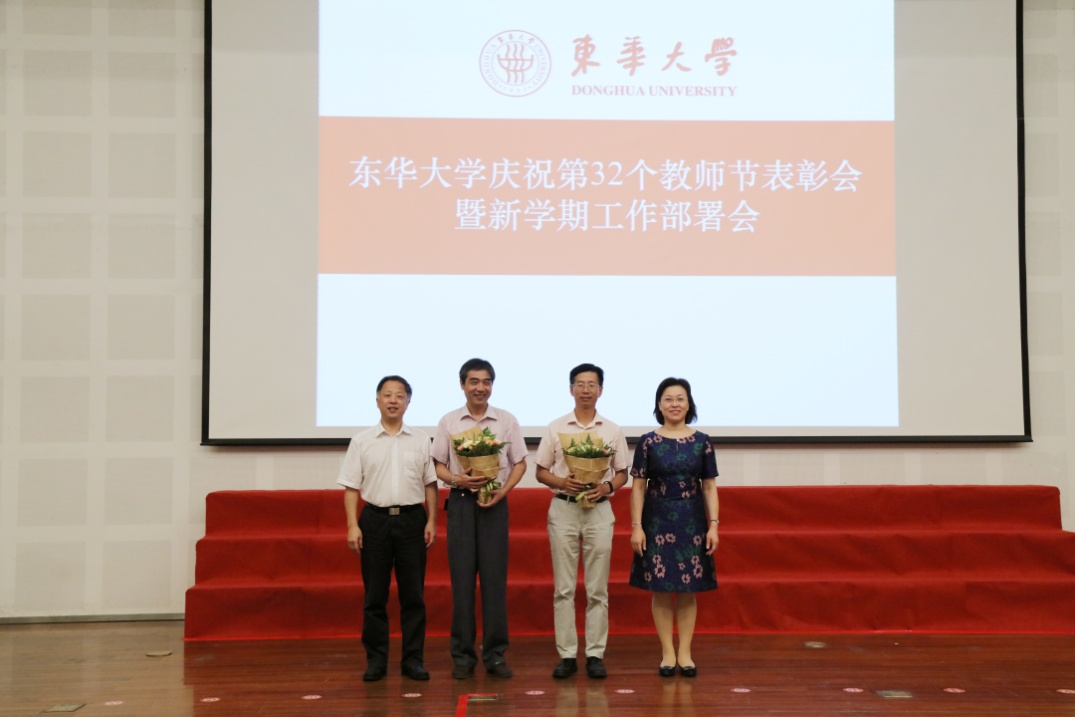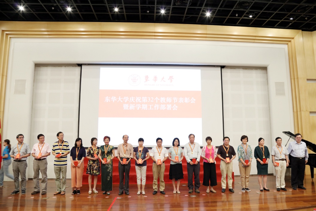 学校对过去一年在教学科研等领域获奖代表、第十六届“我心目中的好老师”、第八届青年教师讲课竞赛获奖选手以及从教30年的教职工代表进行了表彰。2016年上海市五一劳动奖章获得者、材料学院胡祖明教授,2016年上海市教书育人楷模、纺织学院邱夷平教授登台亮相,接过了满载敬意和谢意的献花。第十六届“我心目中的好老师”荣誉称号获得者也走上奖台。11位从学校青年教师讲课竞赛中脱颖而出的“讲课达人”通过视频再现教学风采和分享教学体悟。当从教30年的教职工代表走上奖台时,会议庆祝气氛被推向了高潮,校长蒋昌俊向教职工代表颁发了证书和专门定制的纪念章。