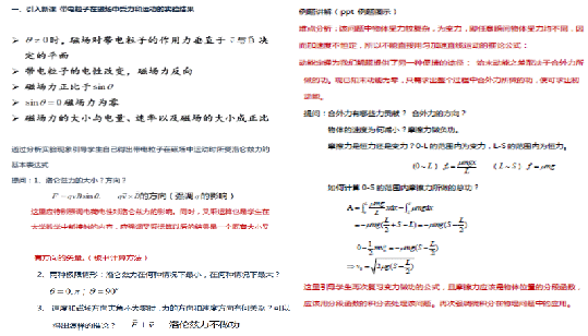 第一、巧妙地引入主题,使学生不感到突兀。物理是理论和实践并重的学科,如果在课堂教学中,学生能够通过一些实验现象,产生一些直观认识,并通过一些逻辑推理和归纳总结的方法,主动得出物理定理、定律和公式,那么这种体验对学生来说无疑是印象深刻的。例如,在讲解带电粒子在磁场中所受的洛仑兹力时,如果教师直接给出洛仑兹力的公式,学生必定觉得抽象难懂、知其然而不知其所以然。因而,在引入洛仑兹力的概念时,我通过带电粒子在磁场中运动的实验现象引入了该物理概念。学生通过对实验现象的归纳总结,自主得到了洛仑兹力的表达式,也使学生们深刻地领悟到学习物理应透过纷繁复杂的物理现象探寻美妙的物理本质,而不必机械地记忆抽象的数学公式。