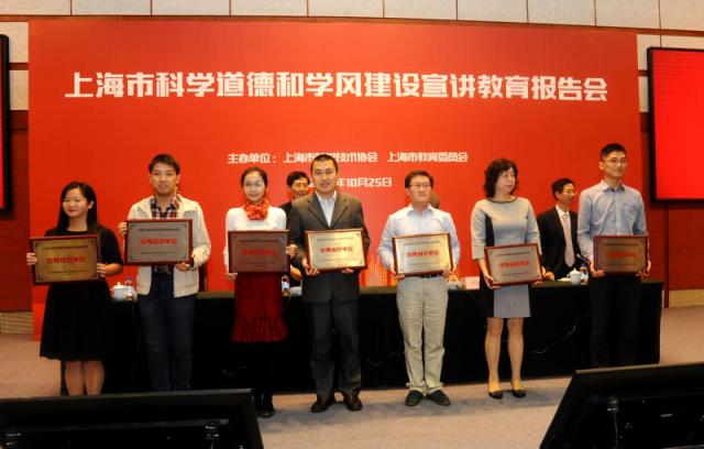 会议对上海市科学道德与学风建设宣讲教育工作近年来表现突出的单位和个人进行了表彰并颁奖。我校荣获上海市科学道德与学风建设宣讲教育工作优秀组织单位,2016上海市教书育人楷模、纺织学院邱夷平教授获评优秀宣讲教育专家,研究生部骆轶姝荣获优秀组织者。校学风建设办公室主任方建安代表学校在主会场接受颁奖。