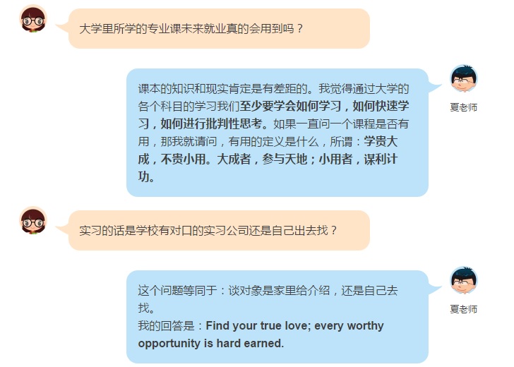 如今的学生并不缺乏信息,而是无法辨别信息,缺乏的安全合格的指路人。因此,老师应该成为学生的指路人,不仅仅是学科知识,更是关于人生很多重大决策。虽然我不自认为是成功人士,但至少我在当学生时的成功经验,失败的教训和所走过的弯路完全可以告诉学生。因此,我自己建设了自己的公众号“夏博士”,一方面成为和学生交流心得的平台,另一方面也推广我的批判性思考理念。比如说,我会告诉学生如何选研究生专业,如何决定是要留学还是考研,等等。学生大多觉得非常受用。