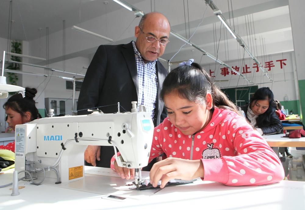 (喀什职业中等学校首届纺织服装专业学生在进行基础缝纫实训。左二为上海援疆前方指挥部人才民生组组长、喀什地区教育局副局长陶文捷)