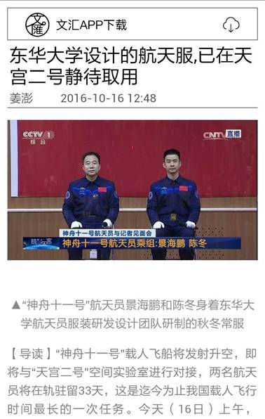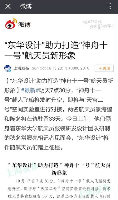 [上海发布]“东华设计”助力打造“神舟十一号”航天员新形象 (上海市政府新闻办公室官方微博)(2016年10月16日)