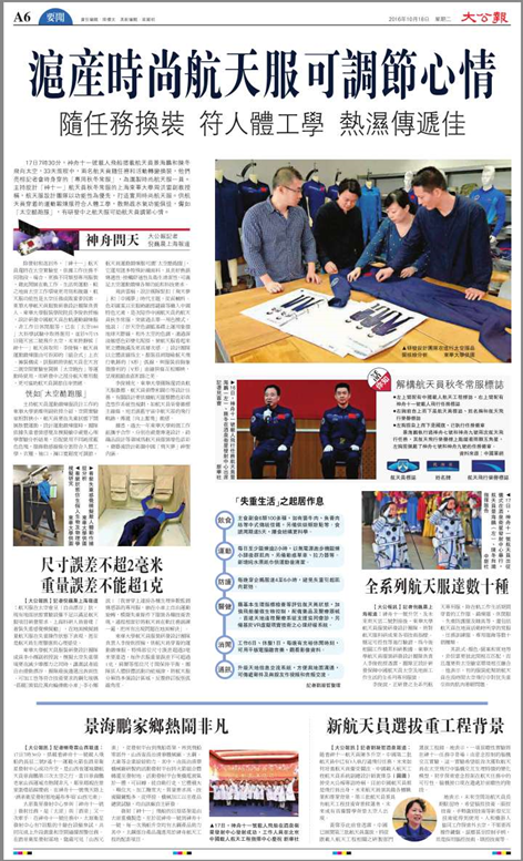[大公报] 沪产时尚航天服可调节心情随任务换装 符人体工学 热湿传递佳 (2016年10月18日)