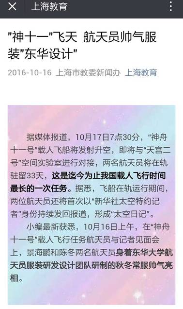 [上海教育]“神十一”飞天航天员帅气服装“东华设计”(上海市教委官方微信公众号)(2016年10月16日)