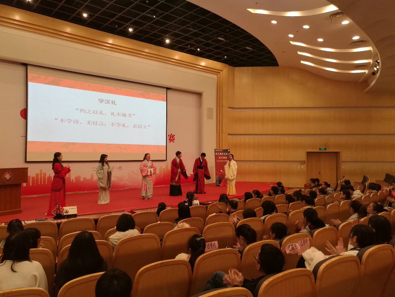 在互动环节中,胡英霞邀请4位同学试穿不同形制的汉服,示范穿法并讲解汉服穿戴的注意事项。另外还讲解了三种对长辈、同辈的揖礼,以及长辈还礼的步骤并做演示。汉未央文化促进中心汉舞教师阿珍为现场师生带来了精彩的汉舞表演,现场师生参与了“投壶”游戏,整场讲座“听、演、互动”相结合,给大家带来了视觉和听觉的多重体验。