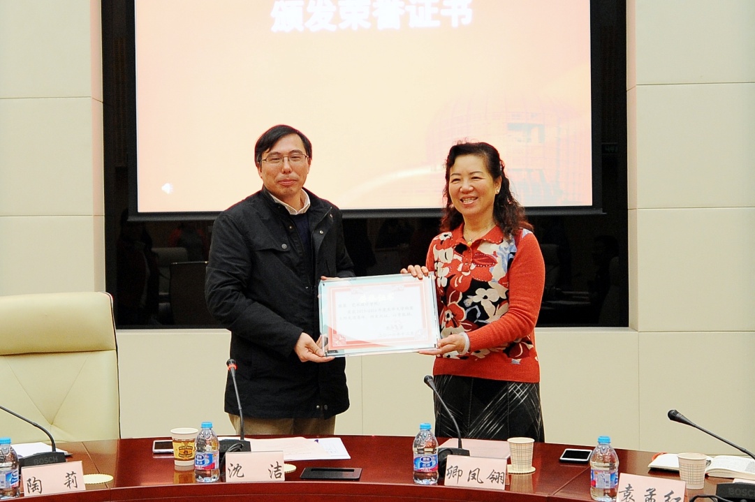 (卿凤翎为档案工作先进集体颁奖,图为服装学院负责人领奖)