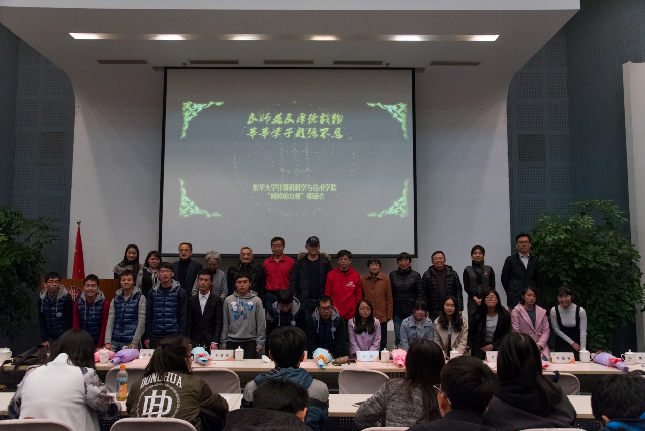 为深入贯彻落实全国高校思想政治工作会议精神,计算机学院于3月17日在松江校区开展“良师益友厚德载物、莘莘学子自强不息——‘榜样的力量’朗诵会”。学生处和计算机学院、理学院有关负责同志及关工委教师代表等两百余名师生参加活动。