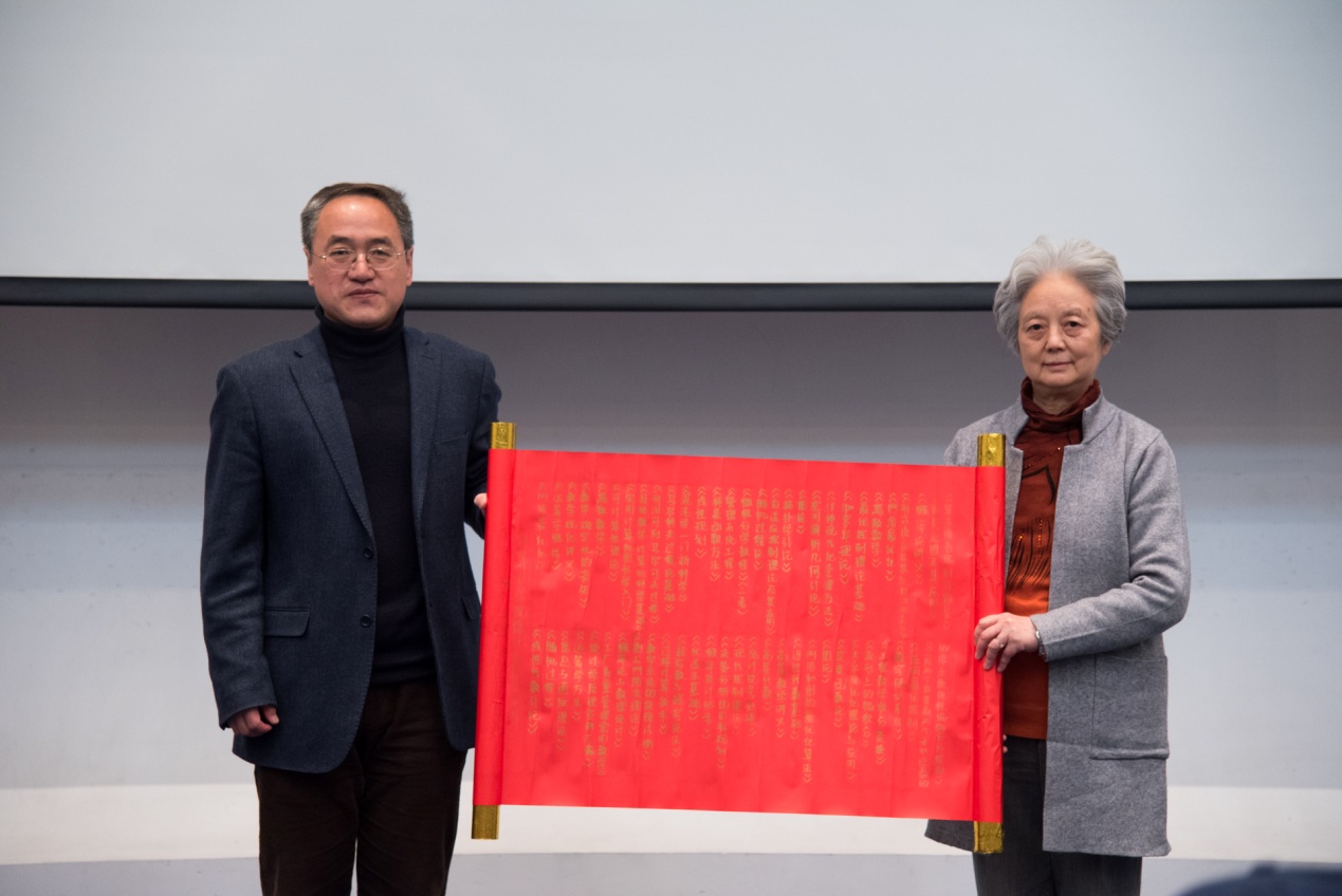 学院退休教师葛华遵循已故老教师徐沅教授的遗愿,以家属身份向学院捐赠了一批数学类专业书籍。随着刘国华院长与葛华老师将密密麻麻写满书目名称的卷轴缓缓拉开,会场响起了热烈的掌声。一行行金色的烫字承载着的不仅仅是一本本书籍与智慧,也是徐沅老师一生勤勤恳恳、认认真真、踏踏实实的写照,更是对同学们的期望与嘱托。