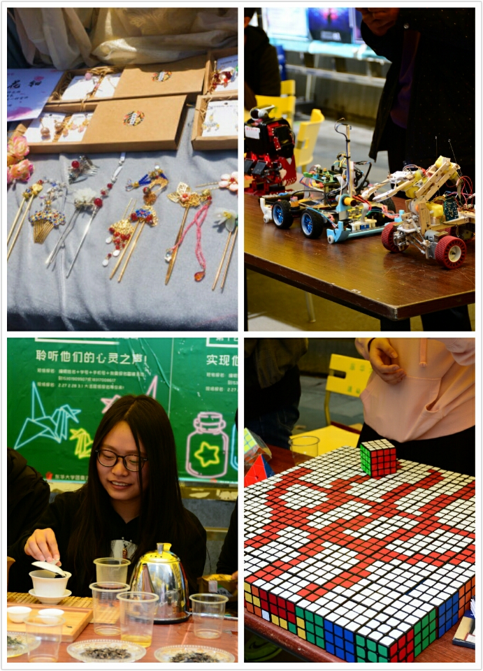 在开幕式的集中展示上,各个学生社团都展示着自己的特色:汉服社不仅带来了中国传统技巧游戏投壶,还展示了各种汉服配饰,增加了同学们对汉服这一中华传统物质文化的了解;创物手作社提供了材料给大家DIY插花和水纹明信片,让大家体验与感受自己动手的乐趣;清风棋社现场摆上围棋、象棋、五子棋的棋子、棋盘,吸引众多同学前来对弈;工业设计协会摆上了玲琅满目的手工艺品,邀请同学们亲身来体验制作;科创未来智能实验室和机器人社摆出了遥控机器人和机器小车,能跳舞能道理的智能机器人引得围观群众们拍手叫绝;魔方社学长学姐们用魔方摆出的精美图案和他们还原魔方时那快如飞的手速让观众们眼花缭乱,拍手叫好;步之火舞街舞社热辣的舞姿转眼间便吸引了一大群人向舞台集中,热情的音乐配上投入的表演,让大家感受到了街舞独有的魅力;云武跆拳道社的表演刚柔并济,叠罗汉、飞踢木板等表演,引得台下叫好声一片;ACE魔术协会的精彩魔术表演,更是让大家都目不转睛;轮之舞轮滑社的表演惊险刺激,轮滑飞跃六人、单脚独立支撑、下蹲滑行令全场观众都赞叹不已。各个社团的表演异彩纷呈,让驻足的师生收获满满。