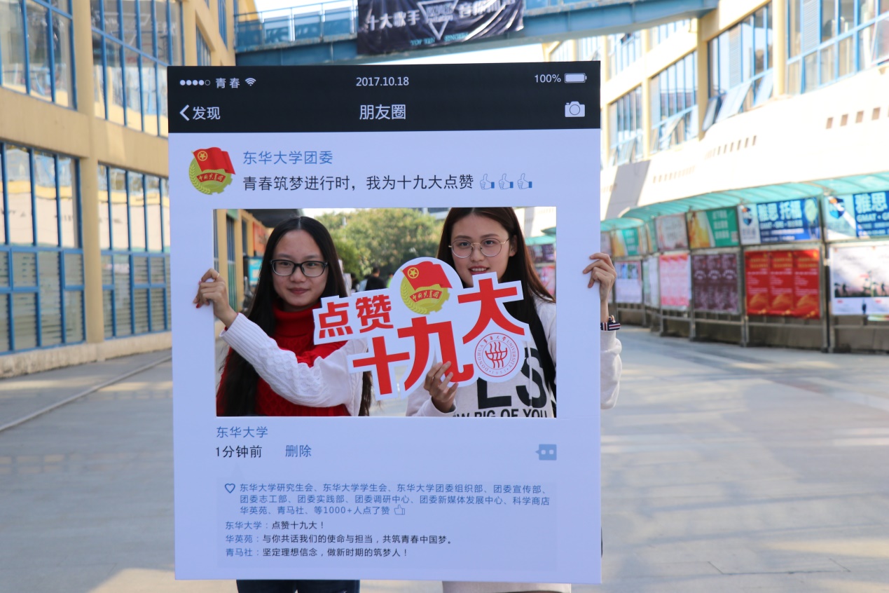 党的十九大报告提出,青年兴则国家兴,青年强则国家强。青年一代有理想、有本领、有担当,国家就有前途,民族就有希望。共青团是党的助手和后备军,是党联系青年的桥梁和纽带。东华团学青年以自己的语言和行动积极响应党中央和习近平总书记的号召,深入学习党的十九大精神,在中国特色社会主义新时代,任重而道远。