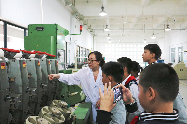 此次活动分为参观、体验和座谈交流等多个板块。同学们参观了纺织科普区、纺纱区、纺织品检测区、优秀服装及布艺设计展示、生物医用纺织产品展示等区域,还亲身体验了织造过程。每个环节都配备了志愿者给学生们讲解演示,从什么是纺织、如何纺纱织布,到如何检测纺织品性能,到纺织品设计的多样化展示,以及纺织是怎样在生物医用领域得到很好的应用,涉及纺织领域的多方面。当谈起纺织品不仅可以满足我们的衣食住行,也可以在医学中应用,甚至可以做成医用缝合线、人造血管等医用材料时,学生们表现出了惊叹。志愿者还特别准备了多种织造小样机,带领学生们用彩色的纱线亲手体验织布的奥妙和乐趣,学生们表现出了极大的兴趣,这个过程也在潜移默化中让学生中领悟了纺织的涵义。活动最后,双方师生进行座谈交流,同学们分享了在活动中学到的新知识和感受,纷纷表示大开眼界、受益匪浅。