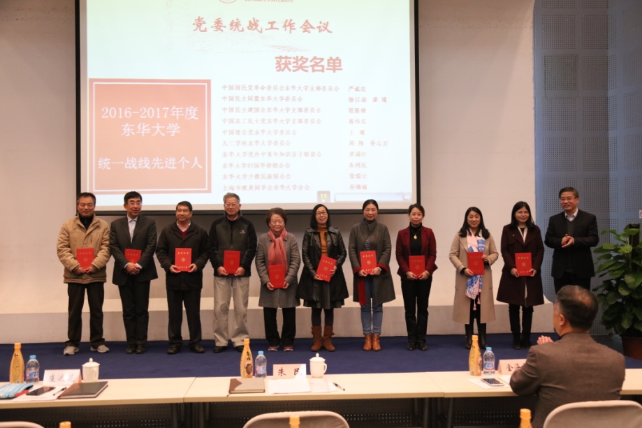 会上,周翔、严诚忠等12名同志获评2016-2017年度统一战线先进个人,他们来自学校民革、民盟、民建、农工、致公、九三6个民主党派组织,以及知联会、侨联、民族联、欧美同学会东华分会4个统战团体。朱民为获奖个人颁发证书。金海燕宣读了表彰名单。