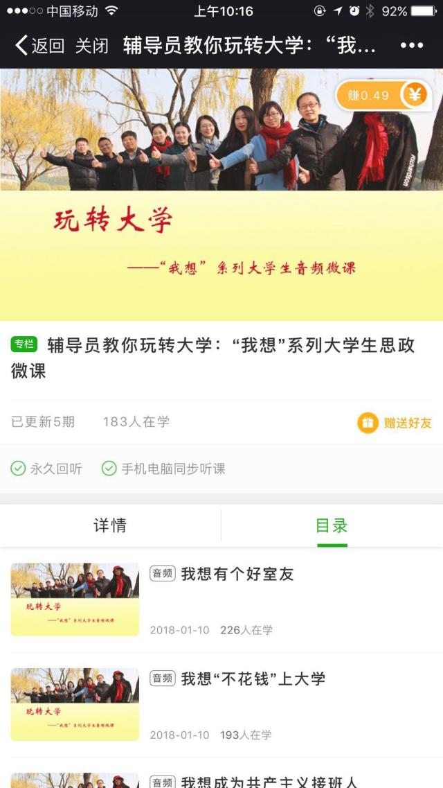 此系列音频微课是经过前期调研了解学生的需求之后,以“及你所想”为主题,以时长约6分钟的录制音频为形式,主要是帮助大学生规划自己的大学生活,解决大学生面临的成长难题、心理困境和职业困惑,为大学生指明方向。专栏一期建设了5 节课,主题包括我想成为共产主义接班人、我想有个好室友、我想“不花钱”上大学、我想拥有完整大学生活、我想了解心理压力放松自我,直接解决学生面临的思想理论教育、大学生资助、寝室关系处理、综合能力锻炼以及心理健康教育5个方面。