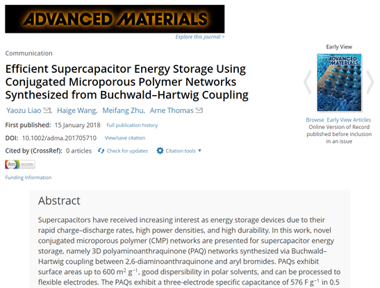 近日,国际知名学术期刊《先进材料》(Advanced Materials》(最新影响因子19.791)发表了我校纤维材料改性国家重点实验室朱美芳教授-廖耀祖教授合作团队和德国柏林工业大学阿纳托马斯(Arne Thomas) 教授课题组合作撰写的论文《利用Buchwald-Hartwig偶联合成共轭微孔聚合物网络用于高效超级电容器能量存储》(Efficient Supercapacitor Energy Storage Using ConjugatedMicroporousPolymer Networks Synthesized from Buchwald-Hartwig Coupling )(DOI:10.1002/adma.201705710),报道了合作团队在能源存储材料领域取得的最新进展。我校系该论文第一完成单位,廖耀祖教授为第一作者并与阿纳托马斯教授为共同通讯作者。论文链接:http://onlinelibrary.wiley.com/doi/10.1002/adma.201705710/full