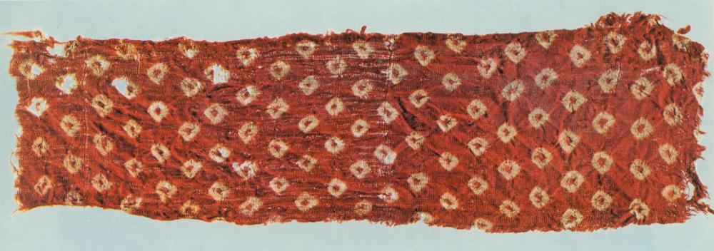 (吐鲁番阿斯塔那出土的西凉红色绞缬绢)