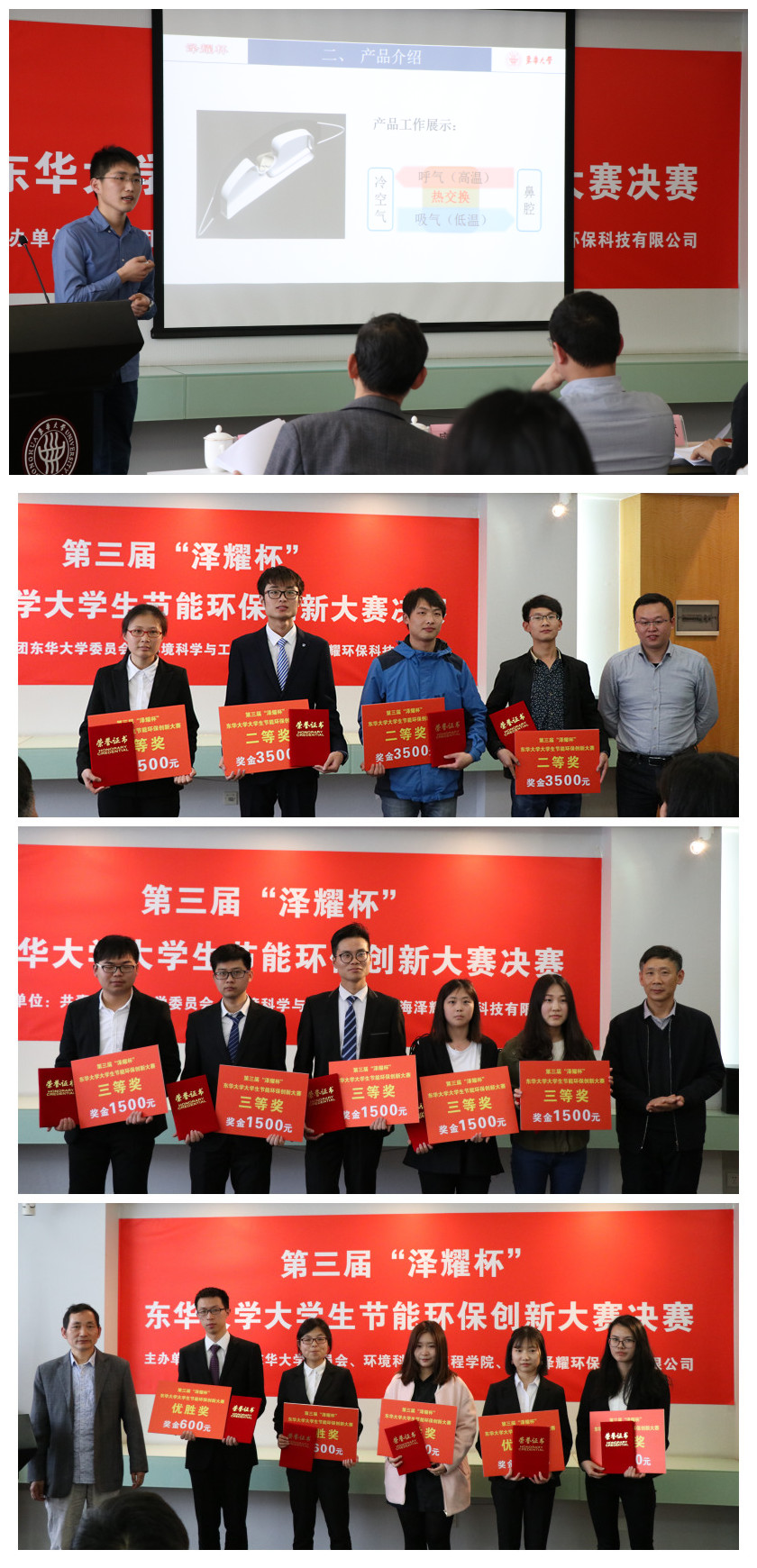 环境学院教授宋新山代表与会评委专家对此次大赛表示充分肯定,指出大学生在进行研究时要以问题为导向,多考虑项目的经济性、实用性,真正做到产学研相结合。上海泽耀环保科技有限公司董事长徐勇在讲话中号召广大学生充分发挥主观能动性,投身于环保行业中去。
