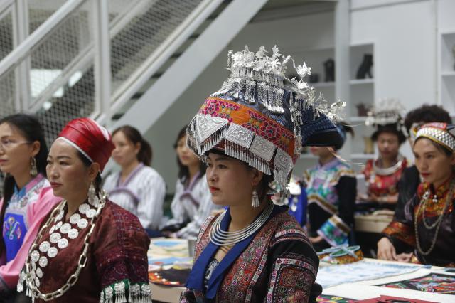 5月8日上午,一批身着盛装的少数民族同胞现身校园,她们是来自贵州的非物质文化遗产传承人,给延安路校区增添了一道亮丽的风景。我校第三期《传统刺绣创意设计》非遗研修班开学典礼在新落成的东华设计园举行,副校长刘春红出席。
