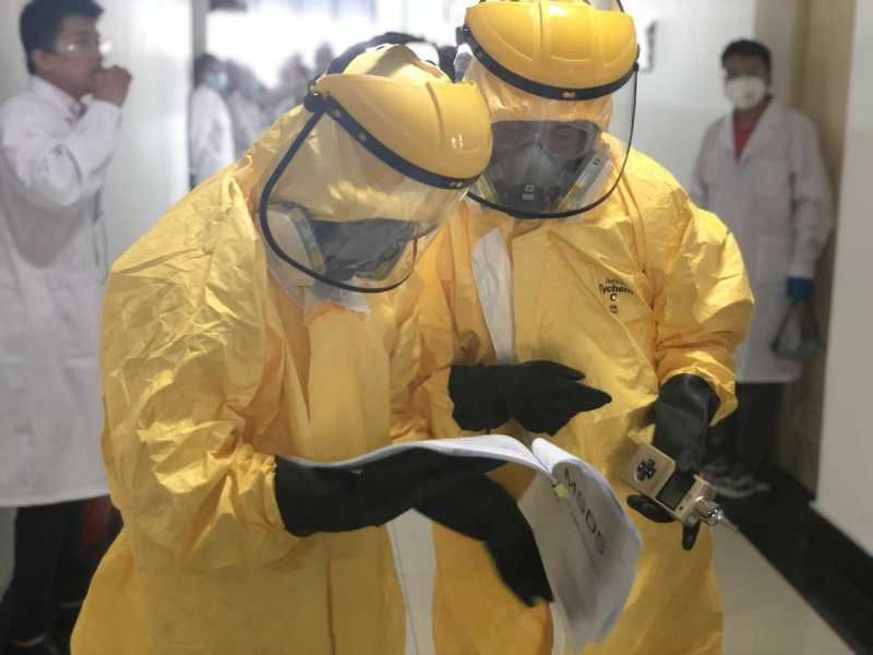 危险化学品应急演练环节在3号学院楼进行,在丁睿的指导下,资产管理处、化学化工与生物工程学院参演师生以实验室浓盐酸大量泼洒为例,演示了危化品泄漏后的规范化应急处置流程。资产管理处、综合治理办公室、教务处,以及部分学院(中心、研究院)的师生现场观摩演练。