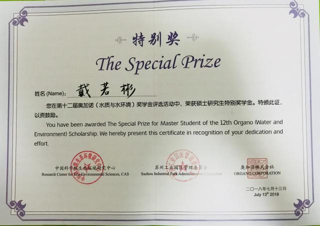 近日,第十二届“奥加诺(水质与水环境)奖学金” (ORGANO WATER PRIZE)最终评审结果揭晓,我校环境科学与工程学院研究生戴若彬同学喜获“硕士研究生特别奖”,这是我校学生首次获得该项殊荣。