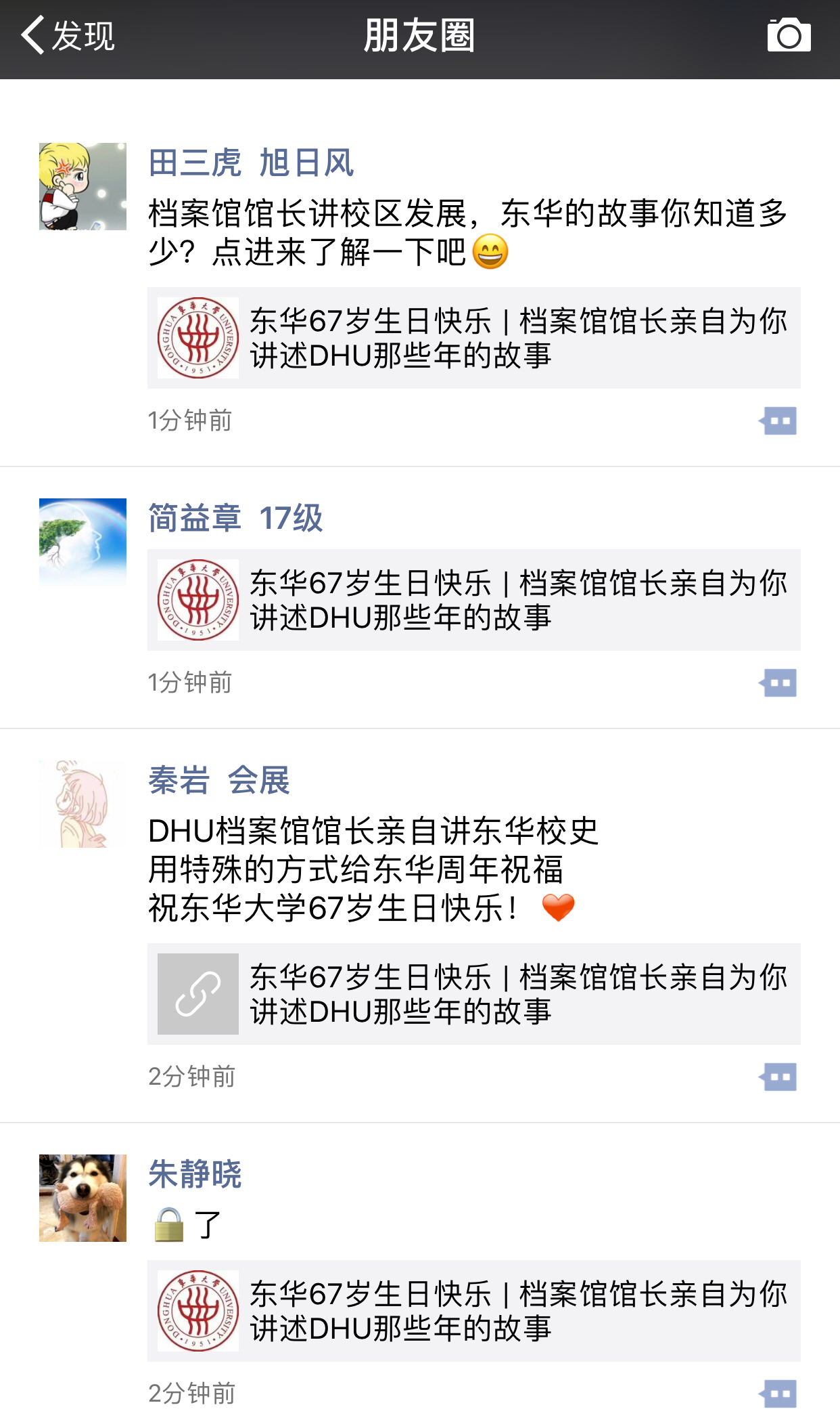 高校的办学历史与国家命运、民族兴旺紧密相连。“东华时光档案”校史微课旨在赋予爱国主义新的价值意蕴,在学校发展历程中涌现的感人事迹,是开展学生爱国主义教育的宝贵资源,一方面能够激发学生爱国和爱校情感,另一方面也有助于学生培育践行以“爱国”“敬业”等关键词为代表的社会主义核心价值观。第一讲上线后,朋友圈被校史微课刷屏,有不少同学通过易班平台留言:“没想到学校还有这么多故事”“地铁上看了一集微课,内容很详实、形式也很新颖,仿佛又参观了一遍校史馆”“看《钱宝钧》话剧,再看校史中的故事,对钱老的膜拜又升了一级”。