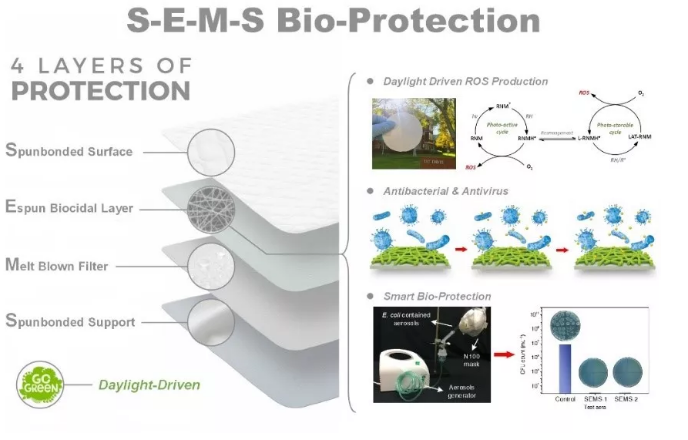 研究人员说,针对流感、埃博拉等通过飞沫传播的病毒,普通防护口罩只能拦截而不能将其杀死,容易导致后续的交叉感染。这一新型纳米纤维材料仅200纳米的细小直径不仅能有效拦截细小病菌,同时还增大了光抗菌反应的接触面积。同时新材料表面的协同光敏结构可产生杀菌活性氧成分,快速破坏细菌膜结构,还可导致病毒蛋白外壳变性失活,杀灭效率均高于99.999%。实验结果表明,传统光抗菌材料需要5到10小时达到的杀菌效果,新材料只需一小时内即可完成。在阳光照射下,后者可在30分钟和60分钟内杀灭大肠杆菌和李斯特菌达99%以上,杀灭T7噬菌体病毒则只需约5分钟。