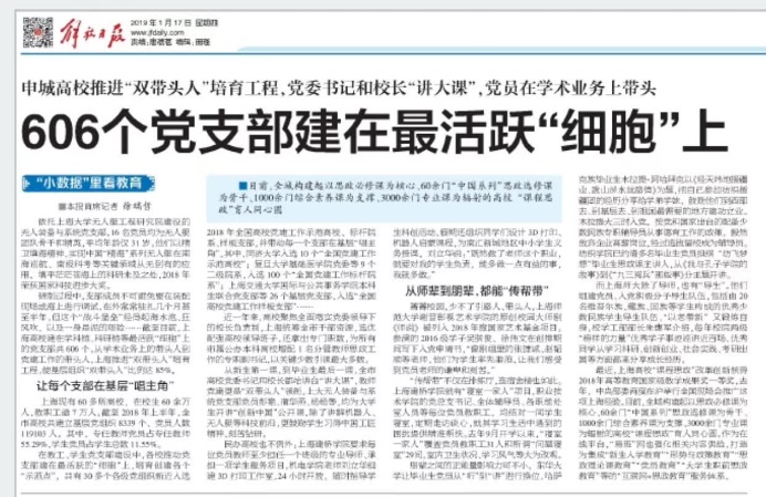 [解放日报等]申城高校推进“双带头人”培育工程,606个党支部建在最活跃“细胞”上