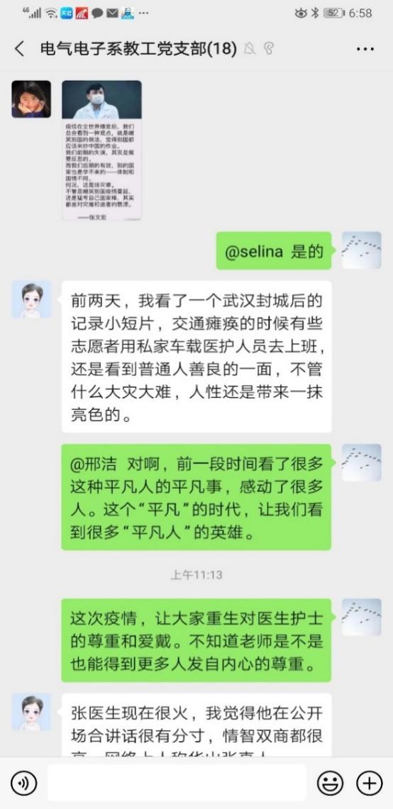 电气电子系教工党支部开展“疫情下的中国与中国认知”主题党日活动,致敬“平凡”时代“平凡人”的英雄;信控中心教工党支部开展“把初心落在行动上、把使命担在肩膀上”主题党日活动分享战疫中的感人事迹;各学生党支部分别组织开展以“把初心落在行动上、把使命担在肩膀上”“疫情下的爱国力量与大国情怀”“战‘疫’显真情、我辈学雷锋”“牢记初心使命,致敬战疫英雄”“同心战疫、慎终如始”等主题党日活动,引导广大党员学习英雄精神,坚定理想信念,共同上好这堂“爱国公开课”,把爱国之情转化为报国之行。党员们充分利用共产党员网、学习强国APP等各类网络平台,加强理论学习,用书法、绘画、视频、接力承诺等方式祝福祖国,传播正能量。