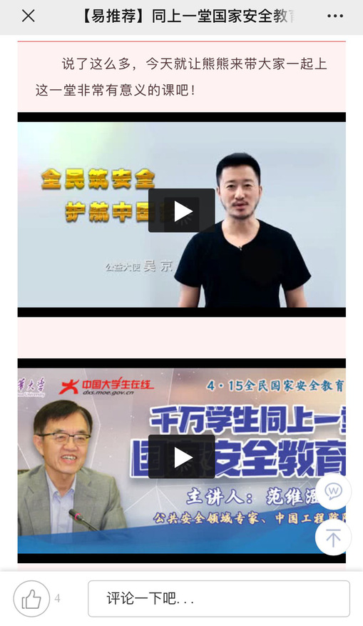 学校在践行立德树人根本任务过程中,将青年大学生培养成国家安全知识的积极传播者放在重要位置。充分利用易班优势网络平台开展网络安全“云教育”,面向全校师生推出《同上一堂国家安全教育课》,通过线上授课的形式,共同学习了教育部组织录制2020年全民国家安全教育日高校公开课,由公共安全领域专家、中国工程院院士范维澄讲授的《总体国家安全观视角下的疫情防控》,累计阅读量达3000余次。开展“我眼中的总体国家安全观”网络作品征集活动,鼓励全校师生利用专业所长创作漫画、诗歌、视频等网络文化作品,用形式多样的作品展现国家安全观的具体内涵、以诗情画意的方式表达学生捍卫国家安全的决心。同时,推出“国家安全,‘易’起守护”“中国看世界,世界看中国”等国家安全教育专题贴,以图文并茂的形式引导学生认识到国家安全、人人有责!