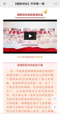“如何用‘键对键’的思政教育模式涵养学生的爱国情怀?”“战疫同心,致学同行,如何才能使线上学习‘不掉队’?”“从中外制度比较的视角下如何看待中国抗疫?”……在学生返校复学期间,学校积极把握教育契机,将大国战疫的生动实践融入思想引领,激发学生爱国力行的责任担当和砥砺报国的初心使命,积极推动高校思想政治工作优势转化为支持疫情防控的强大正能量。