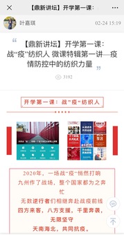 疫情期间如何保障学生思政教育“不断线”?学校各学院充分挖掘提炼疫情防控中所蕴含的思想政治元素,将战疫的鲜活素材转化为提升网络课堂实效的“芳香剂”,让学生在思想熏陶中产生价值认同。管理学院党委推出“师说”系列微课,打造“sunshine微课工作室”,老师和毕业生共同站上“微”党课舞台,讲述与国家同呼吸、共命运的使命与责任。纺织学院打造“锦绣纺织”教学名师思政微课,邀请黄晨副教授带来《疫情防控中的纺织力量》,普及口罩使用知识,树立学科自信,涵养责任担当。