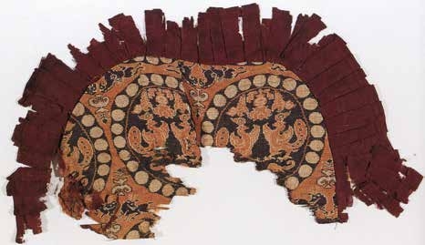 随着丝绸之路文化艺术的交流,西方的织物图案开始影响中原的丝绸设计,大量出土于丝绸之路沿途的公元5-9世纪的丝织品开始出现模仿西方风格的图案题材,包括各种珍禽异兽,如狮、骆驼、大象、孔雀等。书中可以看到,阿斯塔那169号墓出土了一件联珠孔雀纹锦覆面,采用平纹经重组织。主题图案为24个联珠组成的联珠环内站立两只面面相对的孔雀,孔雀振翅立于花台之上,头顶上置一香炉。联珠环之间的辅花为两只回首的大角鹿或相向而奔的翼马,鹿和马的上下方各有一颗花树。