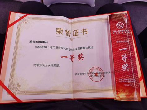 (“滇云蜜语”创业团队获奖证书与奖杯)