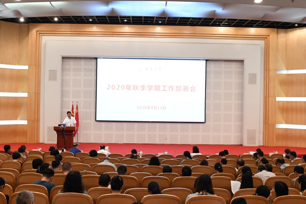 9月15日上午,学校在松江校区召开2020年秋季学期工作部署会,延安路校区设视频分会场。会议强调,要以习近平新时代中国特色社会主义思想为指导,全面贯彻落实党的十九大和十九届中央历次全会精神,深入学习贯彻习近平总书记关于教育的重要论述,坚持党的全面领导、全面落实立德树人、不断推进依法治校,强化以学科建设为统领的高质量发展,深入实施“奋进东华”行动计划,全力做好“十三五”收官总结、“十四五”规划制定以及“双一流”建设周期总结等重点工作,以加快高质量发展的新气象新格局向建党100周年和建校70周年献礼。