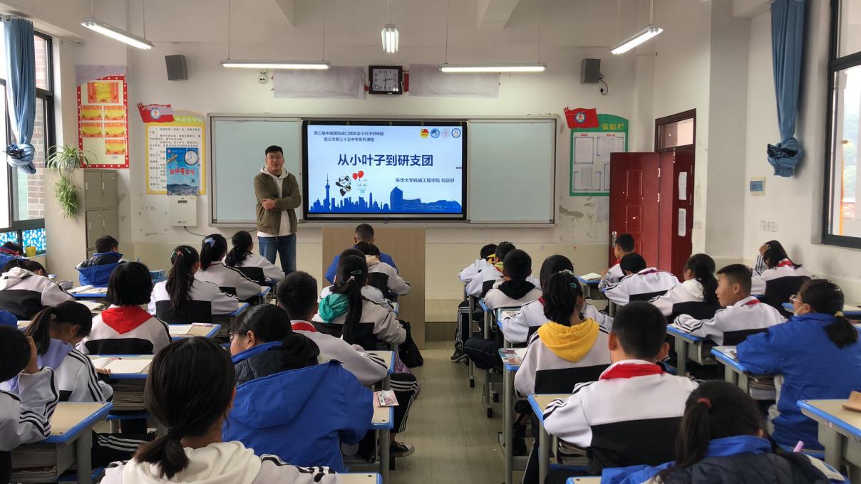 (首届研究生支教团成员刘正好为遵义三十五中的学生分享进博故事)