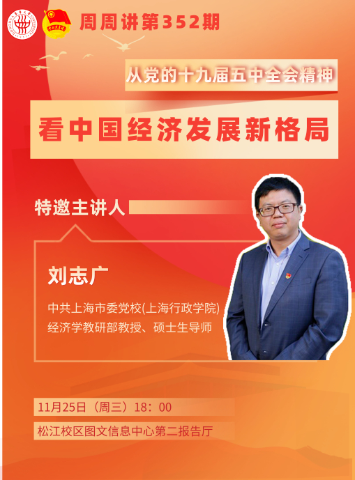 讲座简介:2020年10月26日至10月29日,中国共产党第十九届中央委员会第五次全体会议在京召开。党的十九届五中全会站在党和国家事业发展全局高度,按照党的十九大对实现第二个百年奋斗目标作出的分两个阶段推进的战略安排,综合考虑未来一个时期国内外发展趋势和我国发展条件,对“十四五”时期我国发展作出系统谋划和战略部署。党的十九届五中全会具有全局性、历史性意义。本期周周讲,刘志广教授将带领我们从党的十九届五中全会精神看中国经济发展新格局。
