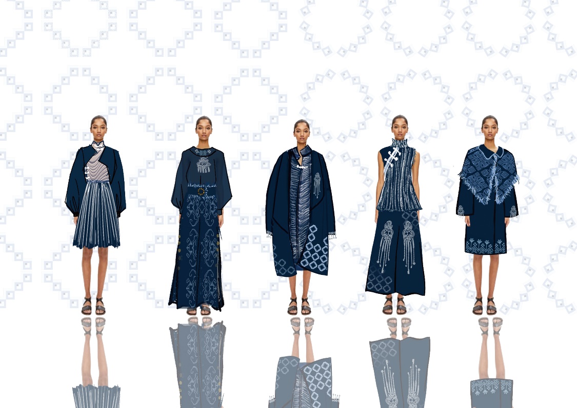 苗族纹样经过几千年的历史文化积淀,蕴含着较高的美学价值和审美情趣。T台上,由艺术设计专业研二学生徐君怡和非遗传承人黄贤梅、田孟勤、冯时素联合设计制作的《苗意》系列服装夺人眼球。《苗意》以苗族挑花背扇纹样、银饰纹样为灵感来源,传承人和研究生共同设计苗族银饰纹样,将传统手艺与现代技术相糅合,探索更多呈现可能。通过激光表面处理技术,把八角纹、蝴蝶妈妈等有苗族代表性纹样呈现在面料上,加以十字绣、打籽绣等装饰,让图案富有层次感。在激光标记的基础上,以锁绣等完成银饰纹样刺绣,再辅以银饰点缀,使服装保留了银饰的灵动感。